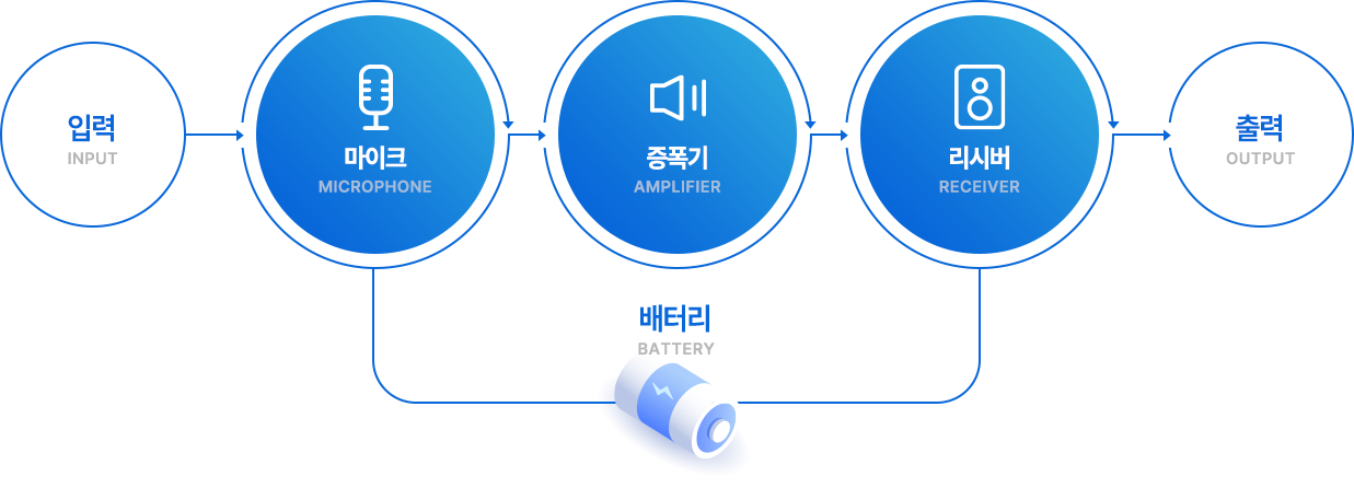 증폭된 소리를 내보내는 스피커(리시버), 그리고 전원을 공급하는 배터리로 구성되어 있습니다.